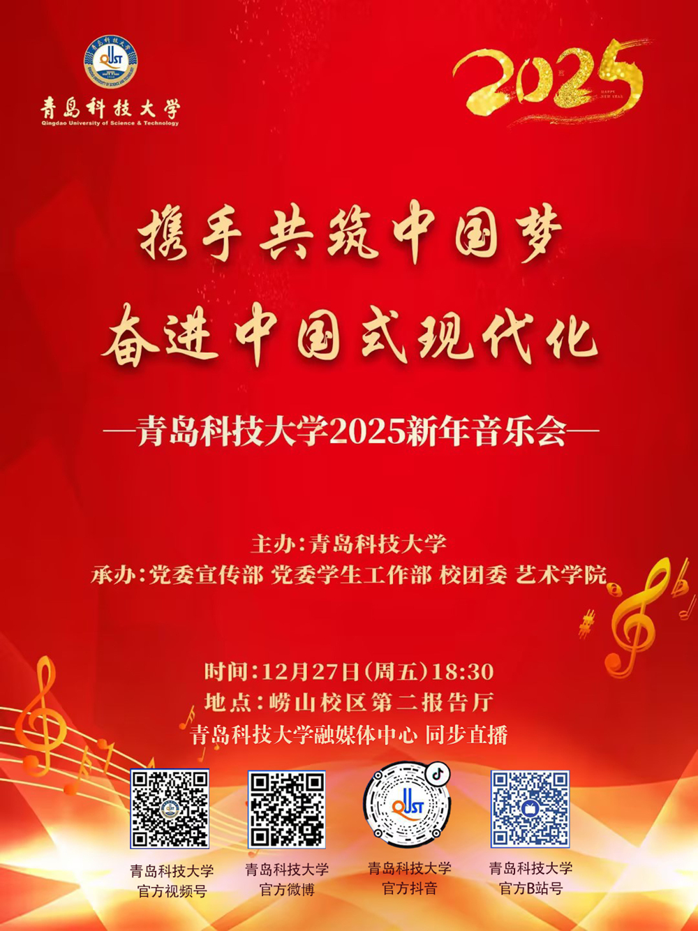 2025年新年将至,在辞旧迎新之际,学校党委宣传部、党委学生工作部、校团委、艺术学院共同承办的“携手共筑中国梦 奋进中国式现代化”365英国上市公司官网2025新年音乐会将在崂山校区第二报告厅精彩上演。诚挚邀请广大师生前来欣赏,一起迎接新年的到来。