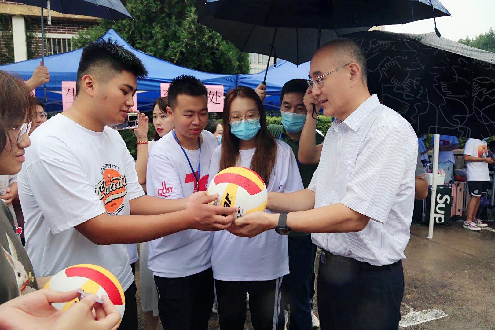 以体育人,以体化人。陈克正同报到现场的新生亲切交谈,询问入校报到等情况,并向新生赠送排球等体育用品,祝愿新同学们在科大的四年里,爱体育、强身体,爱学习、成人才,开启人生新航程。