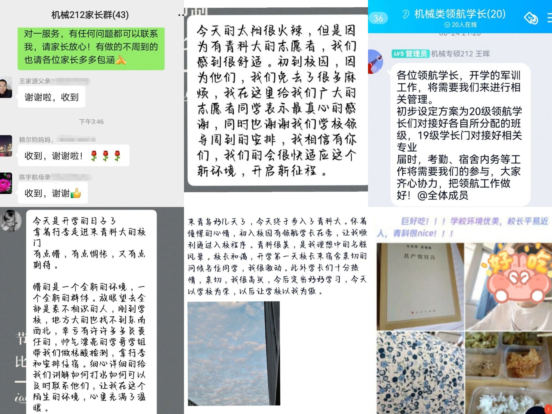 悉“心”培育,全面适应大学。学院将1068名学生在开学前两周完成100%对接,个别电话无法联系到的新生,通过多方途径联系到位。机电学院建立2021级官方新生年级群、专业群、班级群,就校园布局、学业课程、科大美食、周边景区、等进行答疑。提前摸排学生健康码、14天行程轨迹、疫苗接种率、核酸检测证明等信息。建立家长微信群,做好家校共育工作,学生进校后及时了解关注学生动态,做到让家长放心,让学生安心。今天刚到校的新生说:“自从录取结果出来之后,辅导员老师第一时间便与我取得了联系,专业群和班级群中发布了很多有关疫情防控期间返校的温馨提示,老师、学长一一解答。学长老师总是有问必答,给了我们很多学习成长的经验。”更有许多同学在朋友圈空间晒出来自学校无微不至的关怀,老师细心帮助的服务,为学校的疫情防控工作和老师们学长们用“心”服务点赞。