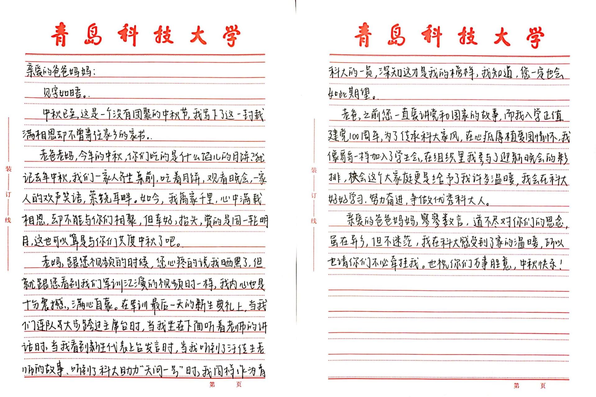 海洋学院为缓解2021级新生中秋佳节思乡之情,特组织“纸短情长,见字如面”活动,“一纸书信报平安,红笺说尽相思意”,号召同学们通过书信的形式传达自己对家人的思念之情。