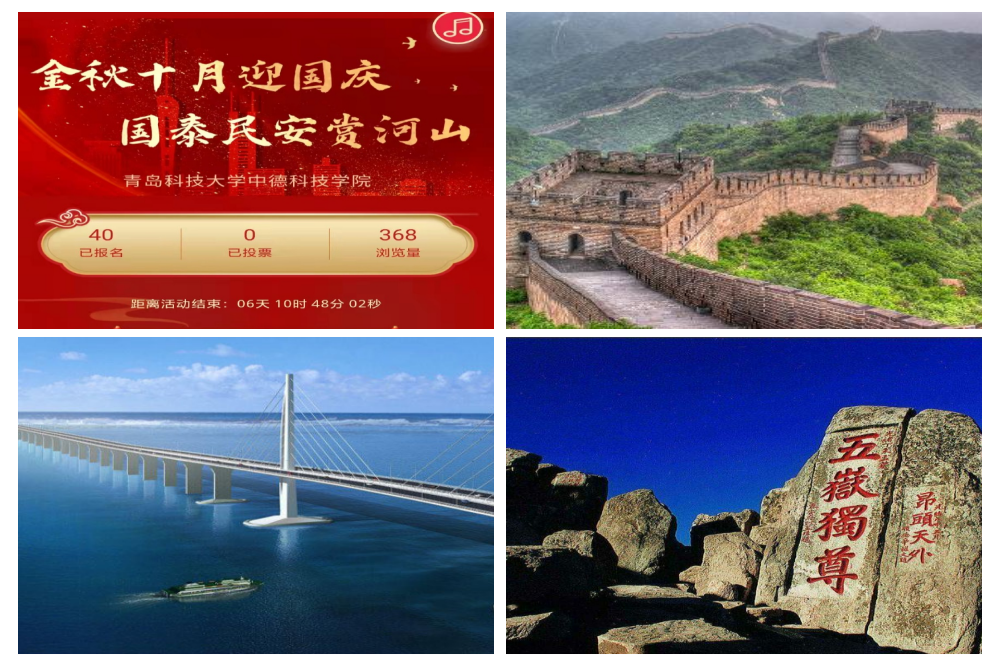 赏大好河山,赞祖国发展通过线上线下举办“金秋十月迎国庆,国泰民安赏河山”照片展示分享活动,同学们积极报名参加,并分享祖国大好河山图景,诉说祖国每一处山脉、每一条溪流的传奇故事,感受祖国的发展变化,为祖国送上最诚挚的祝福。