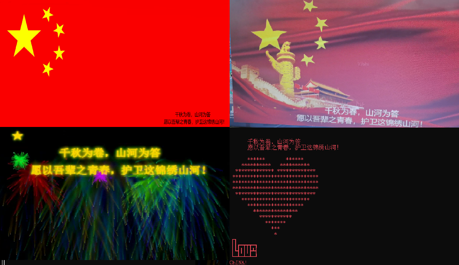 编写情感,代码输出。举办“遨游编程海洋 追随五角星光 ”编程赛。同学们通过专业代码输出表达了对祖国的热爱,展现的有动态的五星红旗升起、绽放烟花庆华诞;文字形态“千秋为卷,山河为答,愿以吾辈之青春,护卫这锦绣山河!”等,用专业知识技能彰显“请党放心,强国有我”的昂扬斗志。