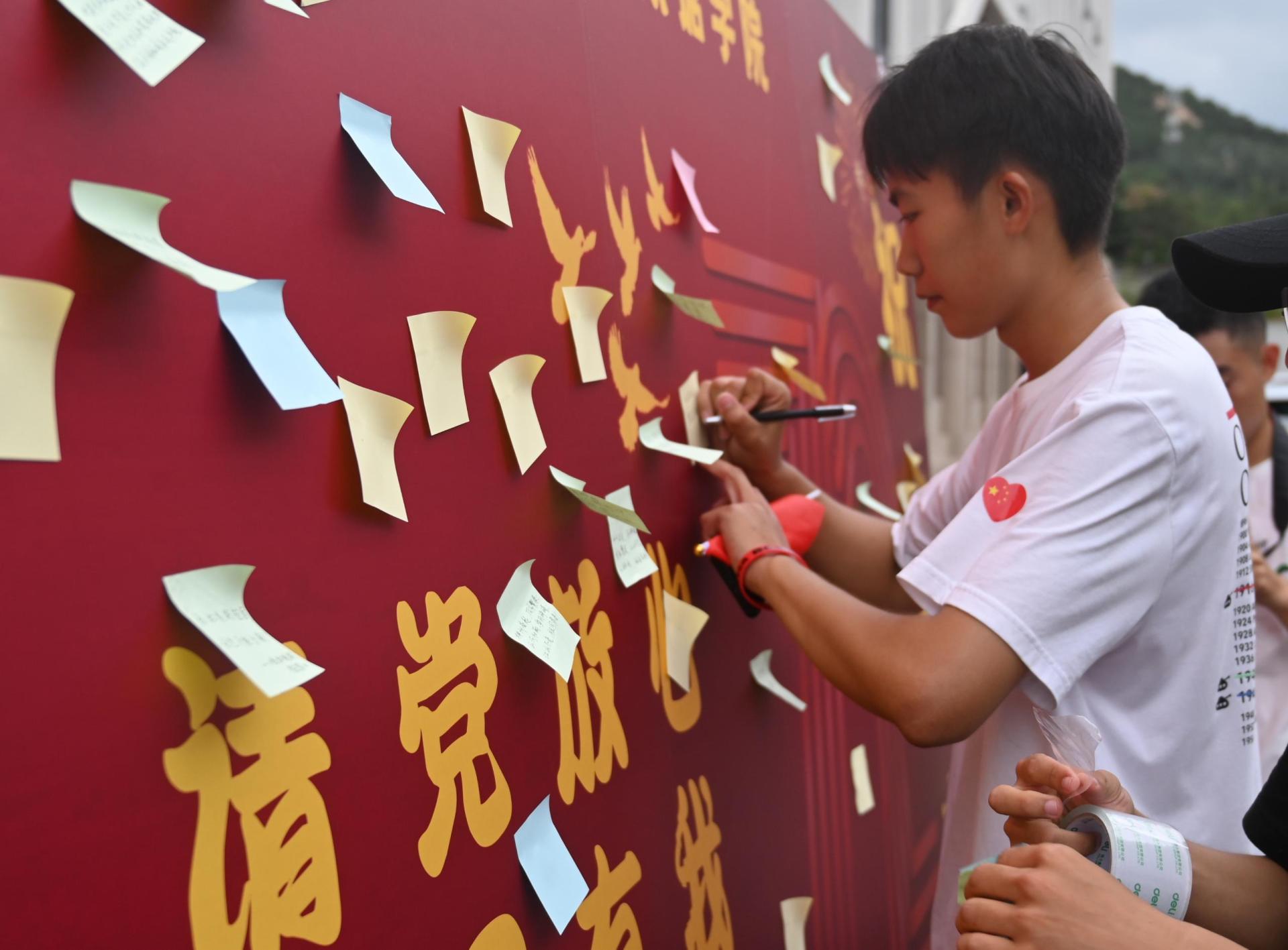 书写祝福,情满中国。举行“请党放心,强国有我”送祝福活动。同学们纷纷在展板上写下自己对祖国母亲的祝福语,富有感情的祝福语不仅留存在了展示板上,也铭刻在了同学们的拳拳爱国心上,深化了同学们的爱国情怀。