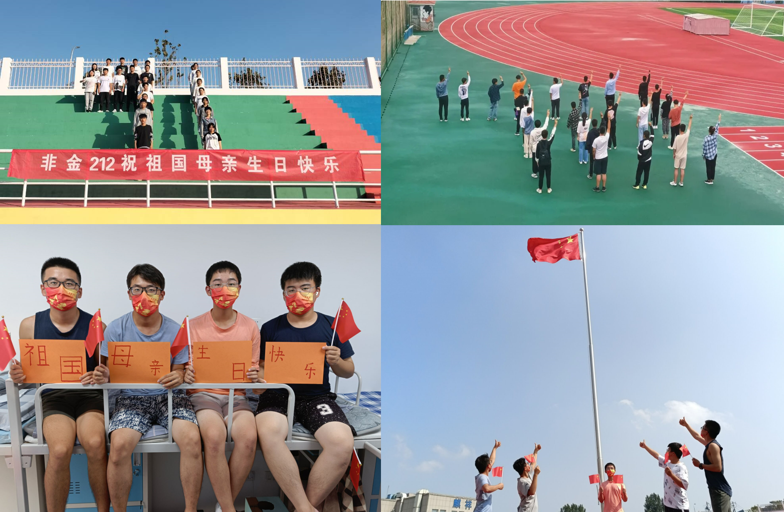 以歌颂祝福,以话赞中国。学院在校园内组织学生开展“我与国旗合张影”“唱响奋斗新时代”“表白最美中国梦”等快闪活动,同学们在操场与国旗合影拍照,在校园中歌唱《我爱你中国》《我和我的祖国》等歌曲,朗诵自己书写的爱国诗句,摆出“72”和“71”的字样,表达对祖国72年风华正茂的赞美之情和对母校71载蒸蒸日上的美好祝福,共同发出“庆祝祖国生辰,成就时代新人。请党放心,强国有我!”的呼喊。