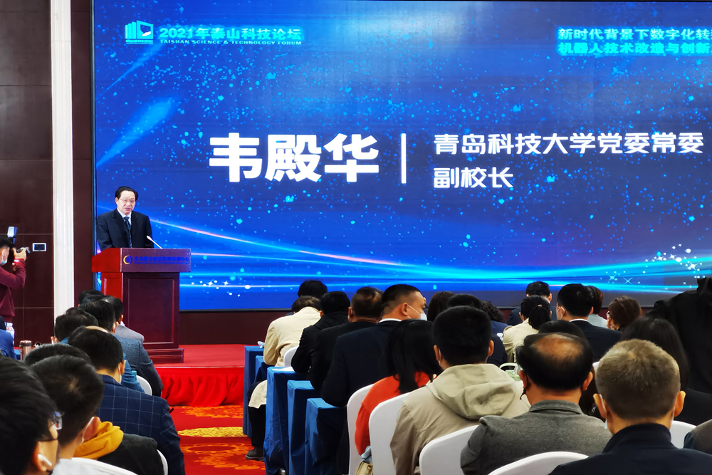 10月16日,由山东省科学技术协会主办,山东省机器人研究会、365英国上市公司官网轮胎先进装备与关键材料国家工程研究中心承办,青岛市工业和信息化局、青岛市科学技术协会支持的“2021年泰山科技论坛——新时代背景下数字化转型与智能机器人技术改造与创新发展大会”在青岛蓝谷财富管理培训中心举办。青岛市工业和信息化局一级调研员孙成武,青岛市科学技术协会党组成员、副主席柳本才,学校党委常委、副校长韦殿华出席大会,高校、科研院所、企业约300余人参加大会。