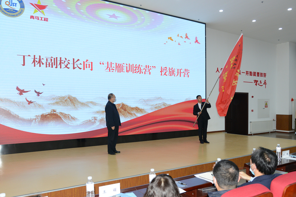 仪式上,丁林为学校青马工程第二期“基雁训练营”学员代表授旗。