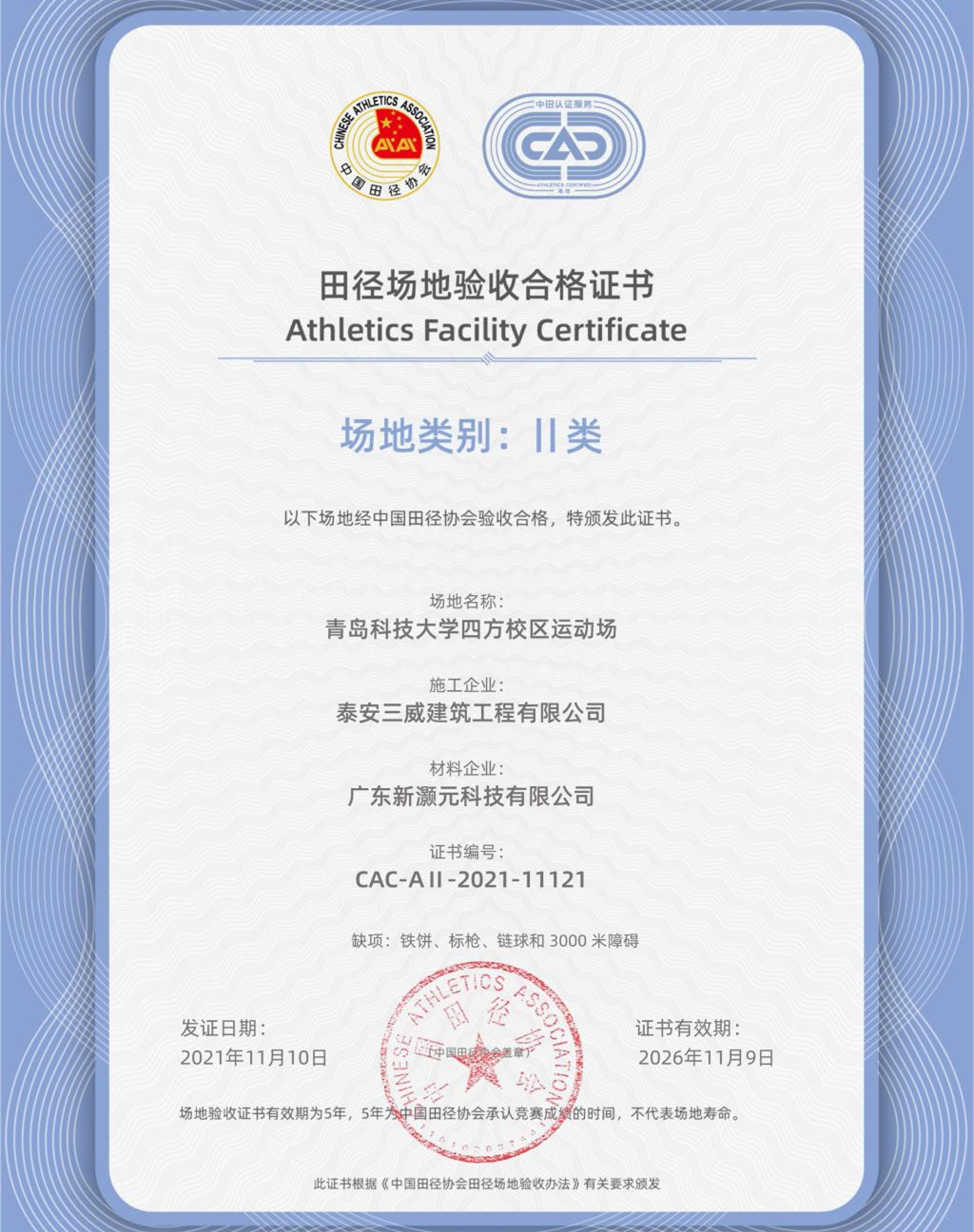 日前,学校四方校区运动场通过了中国田径协会的检查验收,塑胶田径运动场达到国家二类场地验收标准要求,荣获国家二类场地认证。