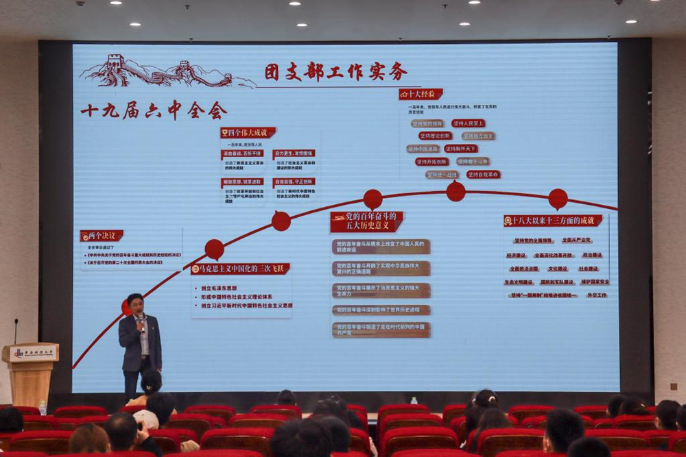 贾明明结合共青团工作,从中国特色社会主义新时代的“历史新起点”“理论新建树”“发展新目标”“矛盾新变化”的四个“新”引入,让同学们明确了新时代呼唤新担当、新时代需要新作为,从团支部工作实务角度阐释十九届六中全会重要精神。