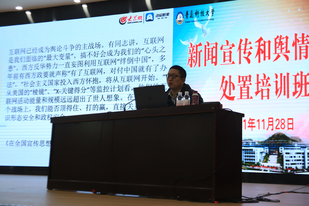 11月28日,学校新闻宣传和舆情引导处置培训班在崂山校区第二报告厅举办。党委常委、党委宣传部(党委教师工作部)部长陈刚出席开班式并讲话。