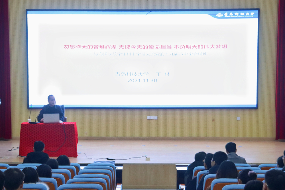 11月30日下午,学校党委常委、副校长丁林在四方校区尚舜学术报告厅为海洋学院作学习贯彻党的十九届六中全会精神专题报告,学院部分班子成员、学工办教师、学生党员、入党积极分子参加学习。