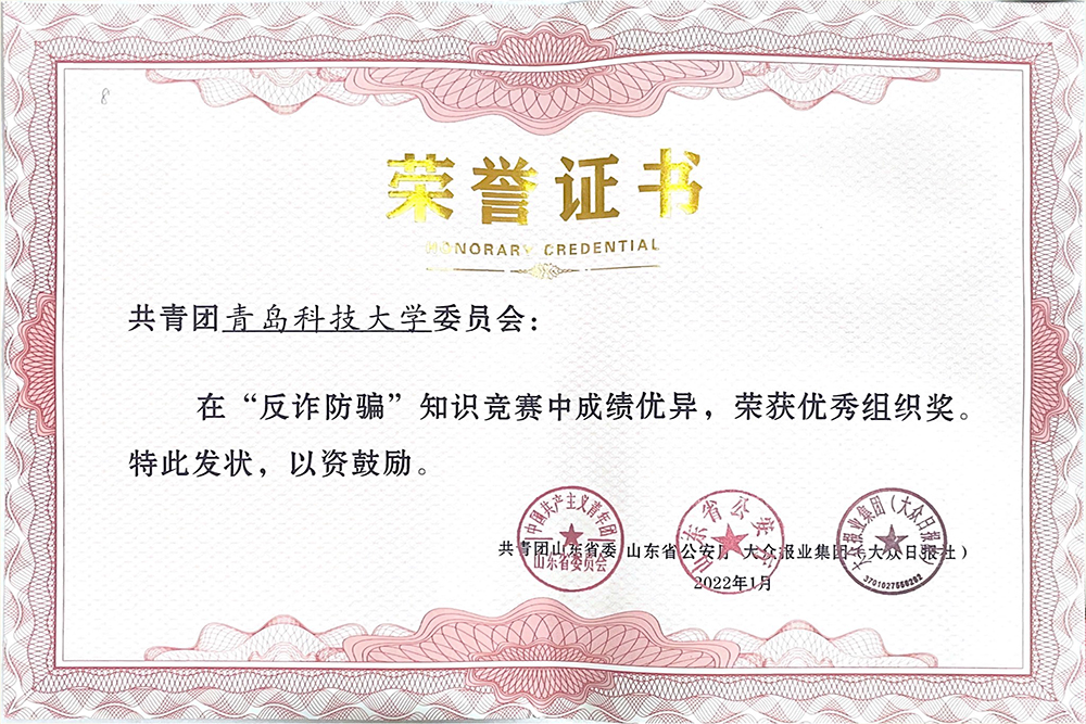 日前,由共青团山东省委、山东省公安厅、大众报业集团(大众日报社)联合举办的山东省“反诈防骗”知识竞赛落下帷幕,我校学生参与数位居全省前茅,学校团委荣获“优秀组织奖”。