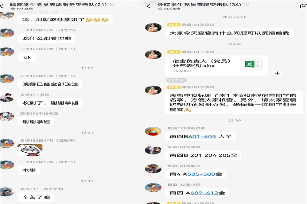 外国语学院第一时间召开疫情防控领导小组会议,传达学校疫情防控工作动员部署会精神,研究制定并迅速落实“六个一”全员战疫举措:召开一次班主任(研究生导师)工作会议、成立一支战疫党员突击队、开展一次战疫专题党课、签订一份党员突击队战疫承诺书、建立一种“党政负责人-分管负责人-辅导员-班长-舍长-个人”六级网格化管理模式、实行一套“一日一布置、一日一总结、一日一通报”的工作机制,进一步压实工作责任,畅通信息渠道,优化工作机制,确保战疫责任落实到最细小的单元,织密全员战疫网,奏响决战新号角。