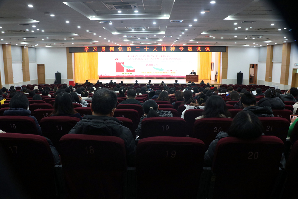 刘明永从深刻领会党的二十大的主题、主要成果,深刻领会过去五年的工作和新时代十年的伟大变革,深刻领会开辟马克思主义中国化时代化新境界,深刻领会中国式现代化的中国特色和本质要求,深刻领会新时代新征程中国共产党的使命任务,深刻领会坚持党的全面领导和全面从严治党的重大部署,依靠顽强斗争应对风险挑战,贯彻落实党的二十大精神推动学校高质量发展八个方面,全面解读了党的二十大报告中的新观点、新论断、新思想,并对重点内容进行深入阐释。他强调,学习宣传贯彻党的二十大精神,是当前和今后一个时期的首要政治任务,各学院要在全面学习、全面把握、全面落实党的二十大精神上下工夫,深刻领悟“两个确立”的决定性意义,始终在思想上政治上行动上同以习近平同志为核心的党中央保持高度一致,牢记“三个务必”,始终坚持“五个必由之路”,踔厉奋发、勇毅前行、团结奋斗,全力推动党的二十大精神在科大落地生根、开花结果,谱写新时代中国特色社会主义更加绚丽的华章。