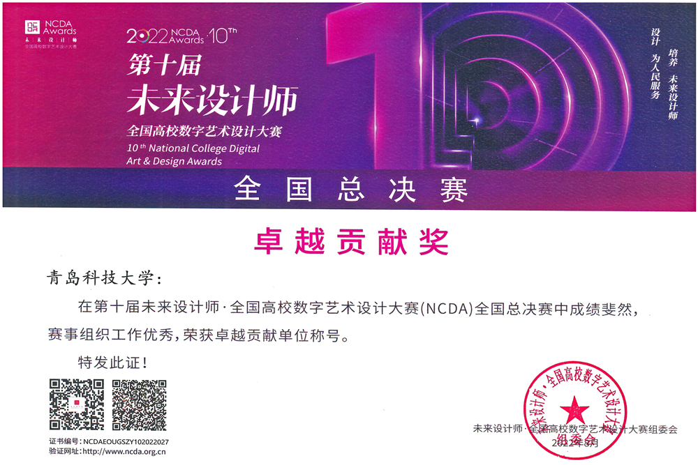 日前,第十届未来设计师·全国高校数字艺术设计大赛(NCDA)省赛、国赛相继落下帷幕。我校组织报送的参赛作品经校内选拔赛、省级评审、全国终审,最终在全国总决赛中荣获国家级一等奖4项、二等奖7项、三等奖4项,山东赛区荣获省级一等奖18项、二等奖32项、三等奖51项,获奖数量及参赛作品均列全省高校第一。学校获评全国总决赛“卓越贡献奖”(全国仅38所)和“省级优秀组织单位”称号,艺术学院教师李航、高密校区教师曹广获评国赛“优秀组织教师”称号。
