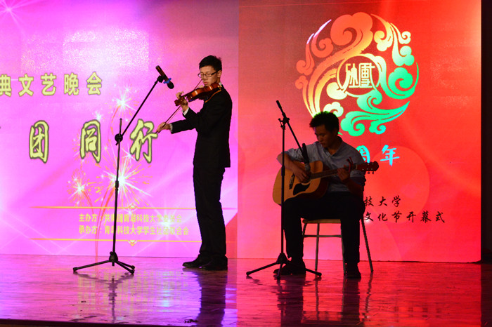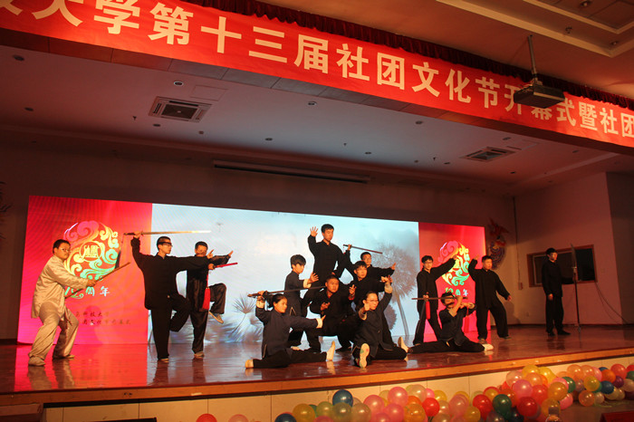 精彩厚重的开场视频带领观众们回顾了我校学生社团联合会的发展历程和历届社团文化节的精彩瞬间。音乐爱好者协会带来的《乐器歌曲串烧》拉开了演出的序幕。轮滑社表演的《无轮无华》,以精彩的轮滑表演、高超的技艺水平赢得了观众们的阵阵掌声;奕剑阁陈氏太极拳协会、梅花桩武术协会、龙影双节棍协会、跆拳道协会带来的武术表演,展现武术运动的刚劲有力和武术文化的博大精深;由红十字学生分会、青年志愿者协会和雨希爱心社表演的手语《我们都一样》,以无声的语言展现了公益志愿类社团发扬志愿服务精神,传递社会大爱的高尚品格;魅影鬼步舞协会的鬼步舞表演、大学生艺术团的爵士舞表演、吉他协会的乐队演出、动漫社的动漫表演,充分展现了科大青年学子的青春风采和艺术水平;演讲与口才协会带来的朗诵《我的未来式》,向广大观众述说了大学四年的学习生活,引导广大青年学生珍惜时光,发奋成才;曲艺协会带来的相声《礼仪漫谈》,以其精彩的表演,展现了传统相声艺术的独特魅力。精彩的节目表演配以背景屏幕中各社团的风采展示,展现了我校蓬勃发展的学生社团和浓厚的社团文化。演出在四方校区社团联带来的合唱《相亲相爱一家人》中落下帷幕。