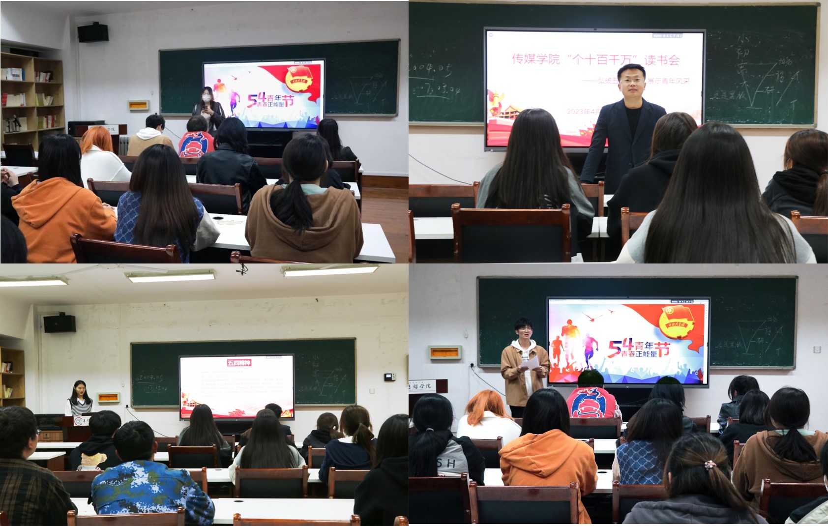 传媒学院团委开展五四青年节系列主题教育活动。举办青年故事分享会,青年学生共同追溯百年征程中的青年英雄故事,选树红色榜样、传承红色精神。举办诗歌朗诵会,青年学生深情朗读,让红色基因、革命薪火代代传承。推进“个十百千万”读书会活动,用生动的语言、详实的内容介绍自己所读书目,表达自己的所感所得。共同观看《觉醒年代》相关视频,体会先辈们不畏艰险、甘于奉献的淳朴爱国之情,营造积极向上的校园文化氛围。