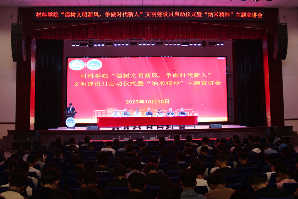 10月10日下午,材料学院“倡树文明新风,争做时代新人”文明建设月启动仪式暨“纳米精神”主题宣讲会在四方校区西礼堂举行。学校党委常委、副校长丁林出席活动。