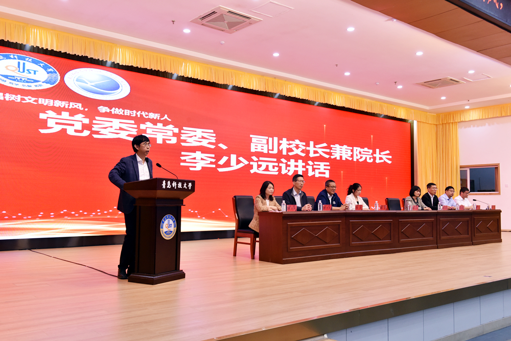 10月19日,自动化学院“倡树文明新风,争做时代新人”文明建设月启动仪式暨2023级新生入学教育大会在崂山校区第二报告厅举行。学校党委常委、副校长兼自动化学院院长李少远,青岛特锐德电气股份有限公司人力中心总监韩增雪、人力资源部部长张莹出席大会。