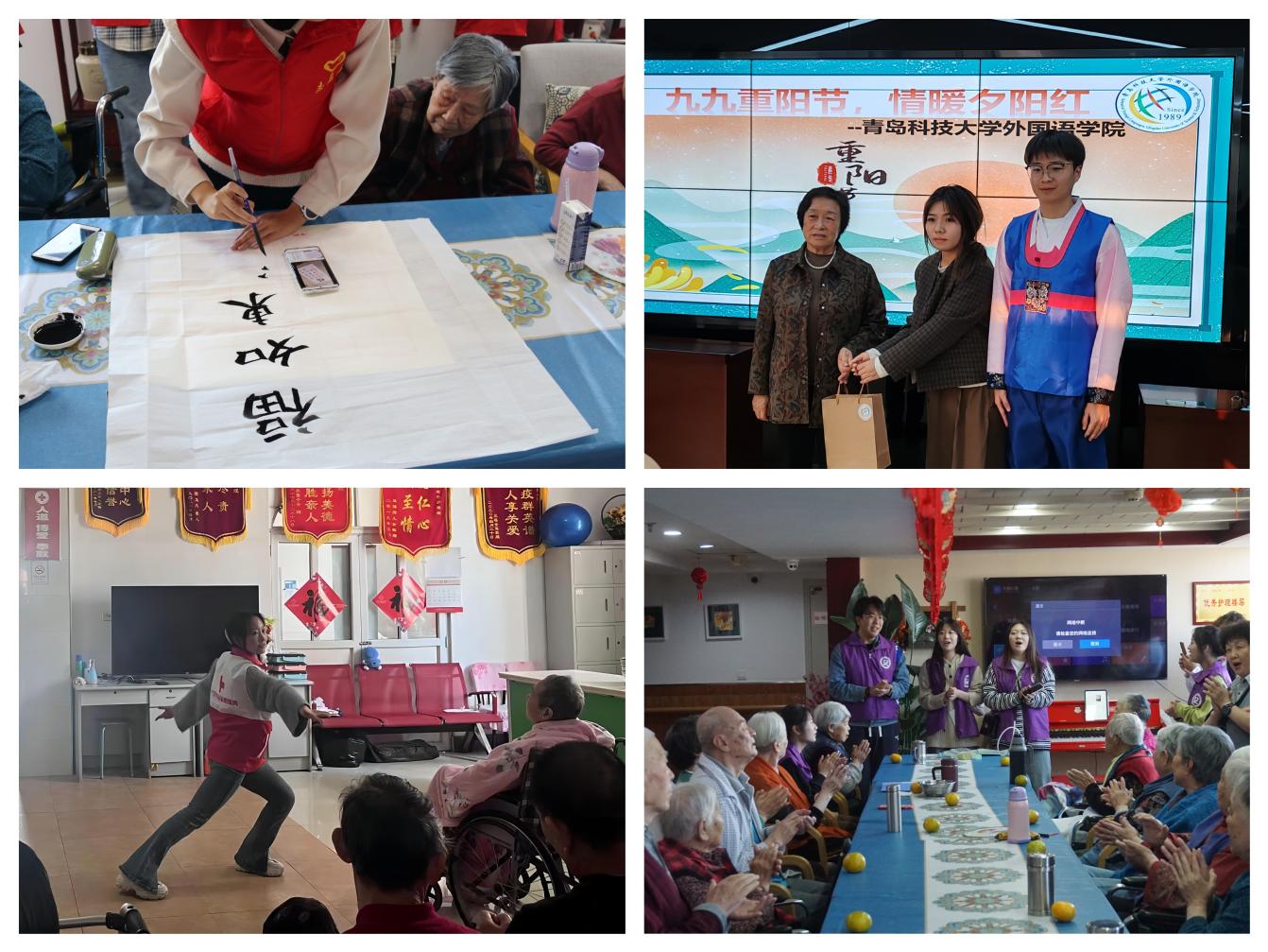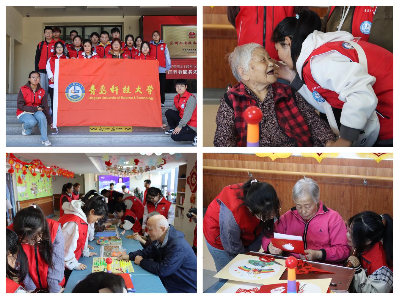 情暖金秋,文艺敬老。机电学院微尘志愿者协会赴珠海路社区开展尊老敬老活动,聆听社区老党员动情讲述祖国从站起来到富起来、强起来的伟大飞跃,陪伴社区老人下象棋、唱京剧,传递新时代尊老敬老正能量,在社区实践中厚植家国情怀、赓续红色血脉;自动化学院星火义工队前往青岛市福山老年公寓活动中心开展志愿活动,为老人们带来了精彩的萨克斯表演,与老人们一同演唱《歌唱祖国》等经典红歌;中德校区志愿团队精心准备了各类文艺节目,为老人们展现了诗歌朗诵、歌曲联唱等精彩表演;艺术学院志愿服务队前往老年公寓,开展了“青春送暖·情系夕阳”主题教育活动,演唱起了爷爷奶奶们熟知的经典红色歌曲——《我的我的祖国》《没有共产党就没有新中国》《打靶归来》;材料学院心“源”材料志愿团秉承“尊老爱老敬老”的理念,通过手指操、游戏互动、文艺展示等多种形式,为老人们带来关爱与欢乐。
