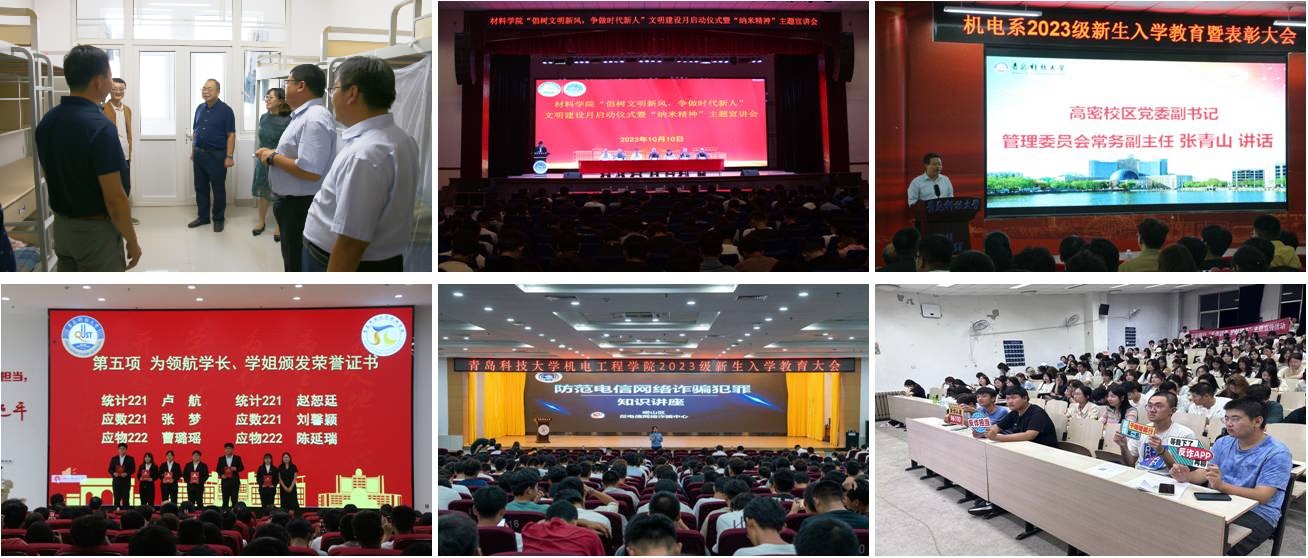 机电工程学院以规范学生文明行为习惯为出发点,开展大学生文明礼仪公开课;将劳动教育引进宿舍园区,加强宿舍文明建设;邀请崂山区警官入校进行反诈骗宣传,筑牢校园安全防线。材料学院依托“材料人”品牌,举行文明建设月启动仪式暨“纳米精神”主题宣讲会,开设“院长课堂”“实践归来话成就”经验分享交流会、班级文化大赛、中秋座谈会等系列活动,帮助新生养成良好的生活习惯。数理学院坚持“校园主基调”,举行2023级新生入学教育暨学风建设启动仪式,制定新生学风建设的工作方案,实行每周两次晚自习打卡,组建党员结对班级,成立成绩学风督导小组等措施,营造优良学风,在考研率、就业率、四六级通过率以及创新创业获奖人数上下功夫。环境学院持续擦亮“环聚群英,渐臻佳境”品牌,组建“圆梦助航团”强化朋辈示范引领作用,开设“知行”化学课堂,推进集体自习,助力新生养成良好的学习习惯。传媒学院开展新生“成长训练营”系列活动,主要围绕学习、竞赛和文体活动等方面为新生答疑解惑,帮助新生快速融入大学生活。高密校区坚持“强化+注重”理念,系统推进安全教育、校规校纪教育、心理健康教育、助学解困教育等,帮助新生及时完成角色转变,合理规划大学生涯,保持自尊自信、理性平和、积极向上的健康心态。