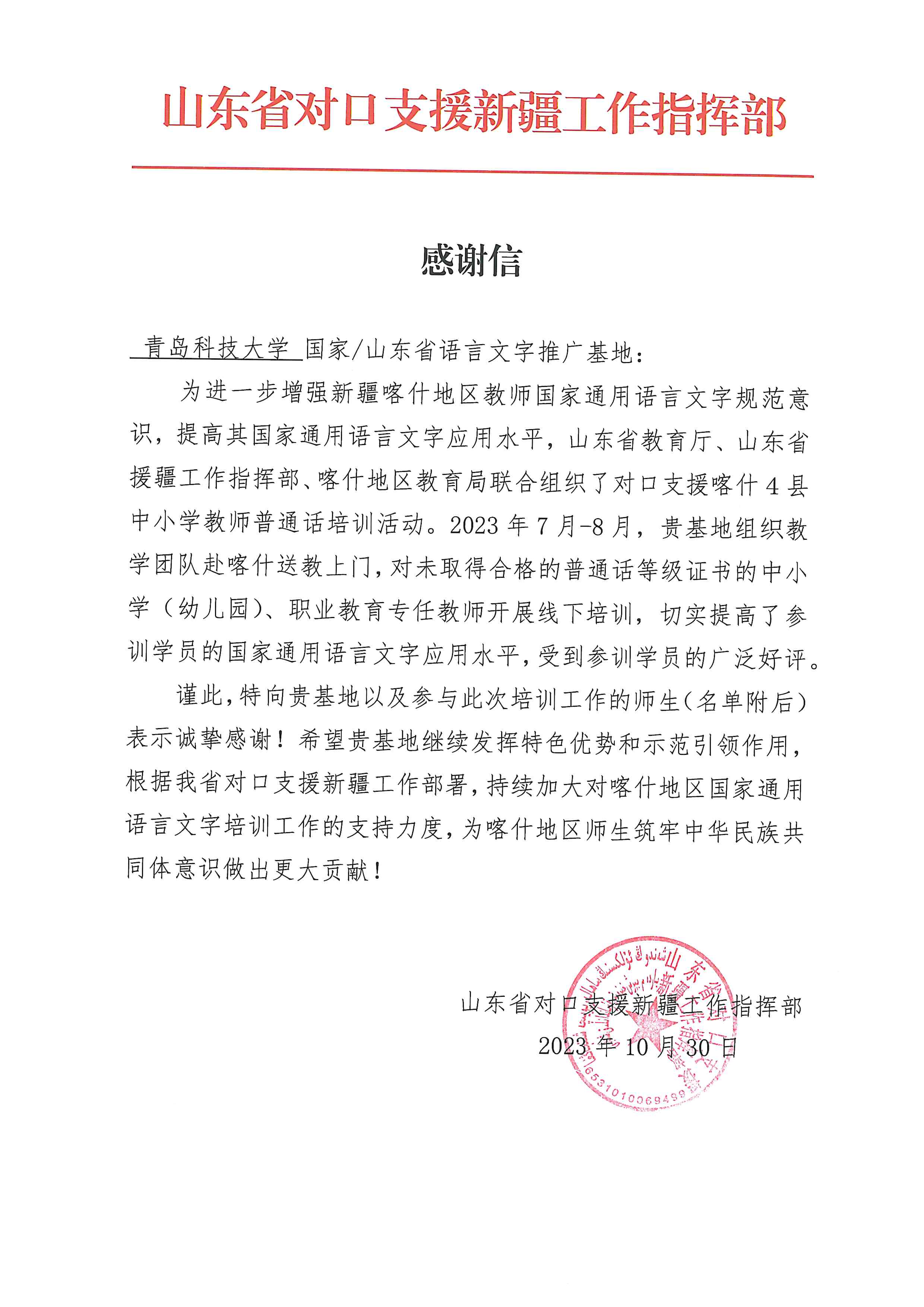 近日,山东省对口支援新疆工作指挥部向学校发来感谢信,向我校参与对口支援喀什地区英吉沙县开展国家通用语言文字培训工作的师生表示诚挚感谢。信中充分肯定了我校语言文字推广基地教学团队在2023年7至8月赴喀什地区送教上门,为新疆喀什地区语言文字的推广作出的积极贡献。信中指出,365英国上市公司官网培训团为打造普通话对口援疆的“科大品牌”,留下教育援疆“科大印记”,真正做到推普助力乡村振兴,受到参训学员的广泛好评,提升国家语言文化素质,促进语言的全民发展,为新疆教育事业的发展贡献自己的力量。希望我校语言文字推广基地继续发挥特色优势和示范引领作用,根据山东省对口支援新疆工作部署,持续加大对新疆喀什地区语言文字培训工作的支持力度,为喀什地区师生筑牢中华民族共同意识做出更大贡献。