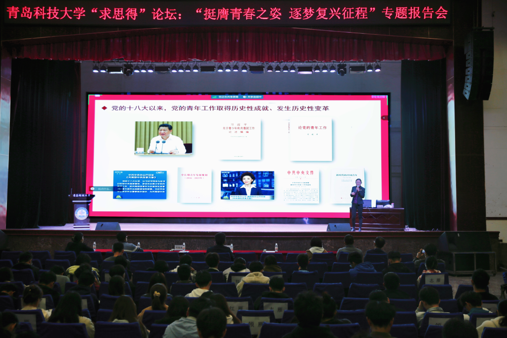 11月21日下午,学校“求思得”论坛之“挺膺青春之姿·逐梦复兴征程”专题报告会在四方校区西礼堂举行,青岛市青年讲师团成员、青岛市团校讲师何南南担任主讲嘉宾,校院两级团组织负责人,学生会、研究生会主席团成员及部门负责人,校青马工程学员、团校学员,青年学生代表共计1500余人通过线上线下参与本次报告会。