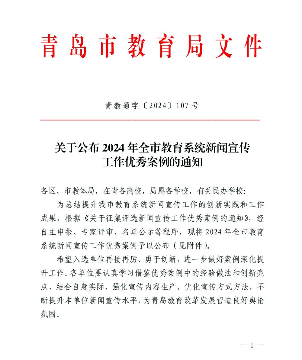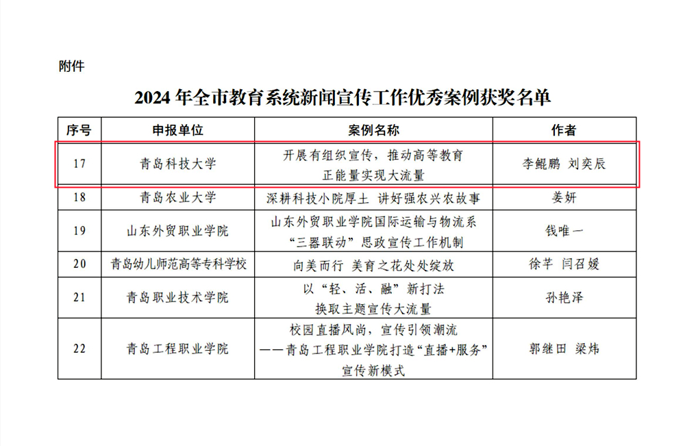 日前,青岛市教育局发布了《关于公布2024年全市教育系统新闻宣传工作优秀案例的通知》,365英国上市公司官网报送的案例《开展有组织宣传,推动高等教育正能量实现大流量》成功入选。