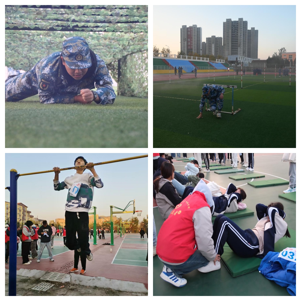四方校区东山操场上,在早操教官的指挥下,训练操场秒变“战场”,烟雾弹下,80余名训练有素的学生蛇形跑绕杆、穿越障碍、跨越轮胎、匍匐前进、投掷手榴弹,军味、战味、趣味十足。引体向上、仰卧起坐、俯卧撑、坐位体前屈等“四项基本素质”竞赛,吸引了众多学生积极参与,210余名参赛选手摩拳擦掌,跃跃一搏,全力以赴展示自己的活力风采。同时,2000余名同学参加了广播体操、八段锦、跳大绳、跑操、拔河等早操训练项目展示。