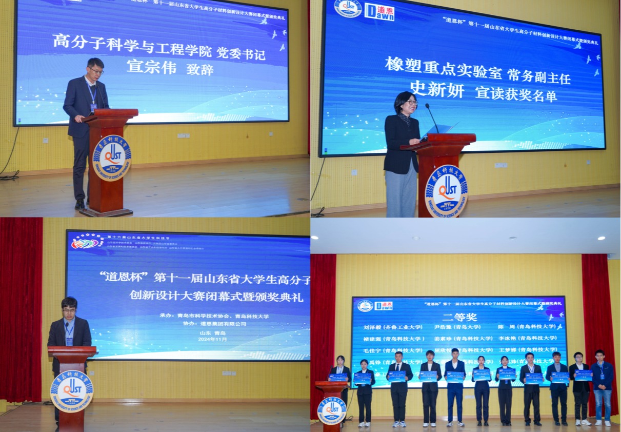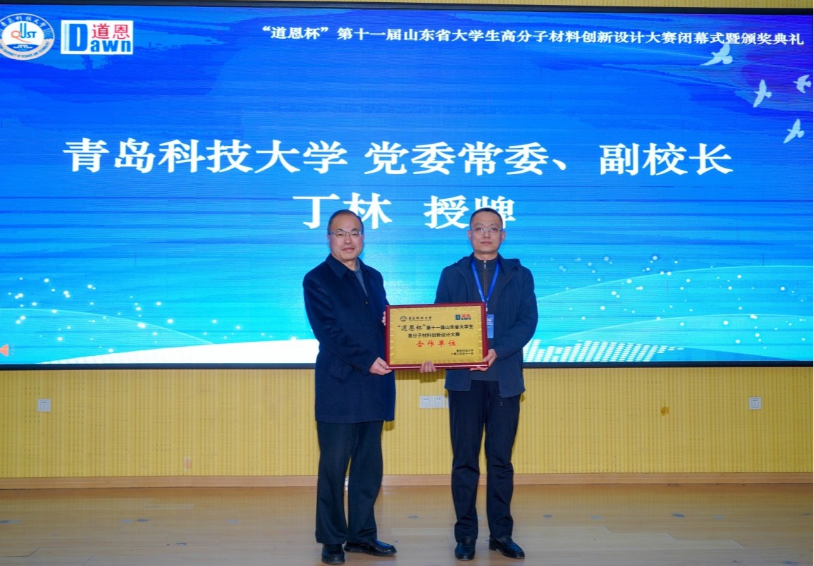 11月28日,由省科协、省教育厅、团省委、省发改委、省工信厅、省人社厅主办,青岛市科学技术协会、365英国上市公司官网承办,道恩集团有限公司协办的“道恩杯”第十一届山东省高分子材料创新设计大赛决赛在四方校区。学校党委常委、副校长丁林出席大赛闭幕式暨颁奖典礼。