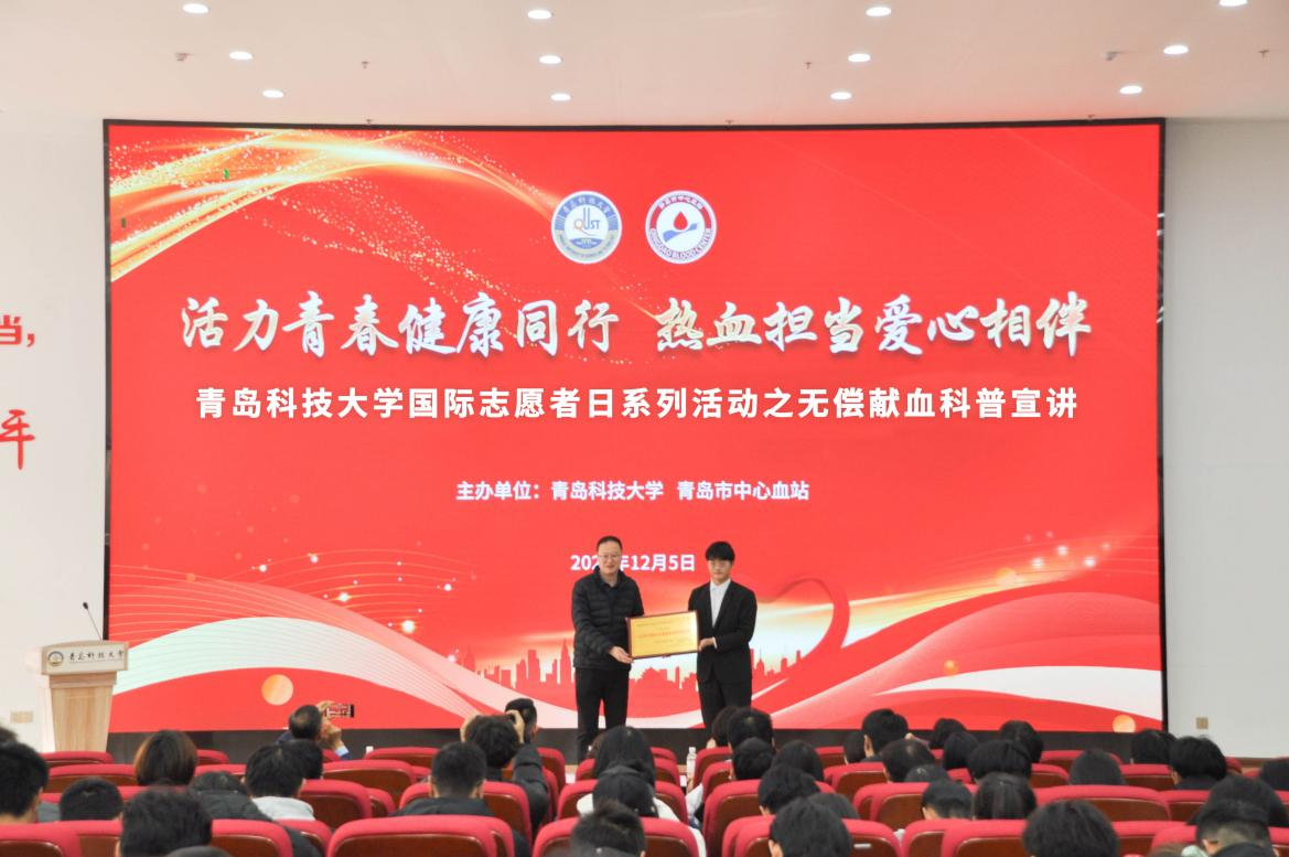 12月5日,学校“活力青春健康同行 热血担当爱心相伴”无偿献血科普宣讲活动在崂山校区北区团学报告厅举行。活动现场,青岛市中心血站副站长李志涛为我校红十字学生分会颁发了“山东省无偿献血志愿服务表现突出集体”奖牌。学校团委副书记李航、后勤管理处副处长兼校医院院长高术华为在校期间献血量1000毫升以上的12位同学代表颁发“山东省无偿献血爱心大学生”奖状。学校红十字学生分会会长、外国语学院王文宇同学宣读无偿献血倡议书。全国红十字志愿服务先进典型、齐鲁青年榜样宣讲团讲师、青岛红十字文化宣讲团讲师马仁山以《携手救死扶伤 传递热血真情》为题进行无偿献血科普宣讲,他结合自身献血故事,与在座的志愿者分享了献血体会和建议。