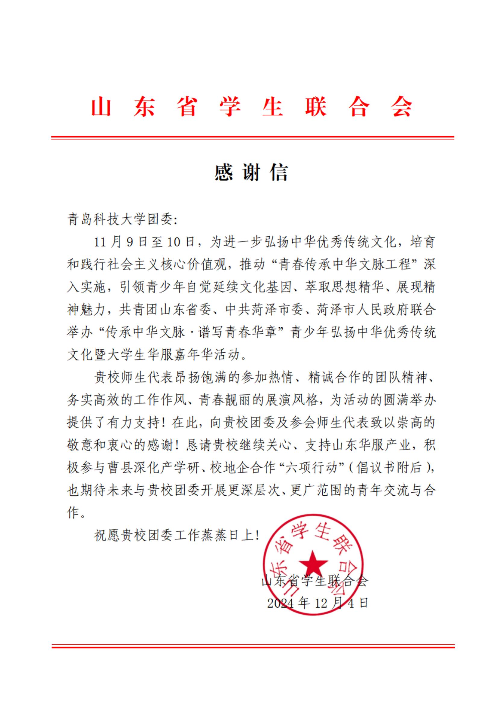 11月9日至10日,由共青团山东省委、中共菏泽市委、菏泽市人民政府联合举办的“传承中华文脉·谱写青春华章”青少年弘扬中华优秀传统文化暨大学生华服嘉年华活动在山东曹县举办。学校学生社团汉韵研习社4名成员受邀参加本次活动。近日,山东省学生联合会向我校团委发来感谢信,对我校师生积极参与此项活动表示感谢。