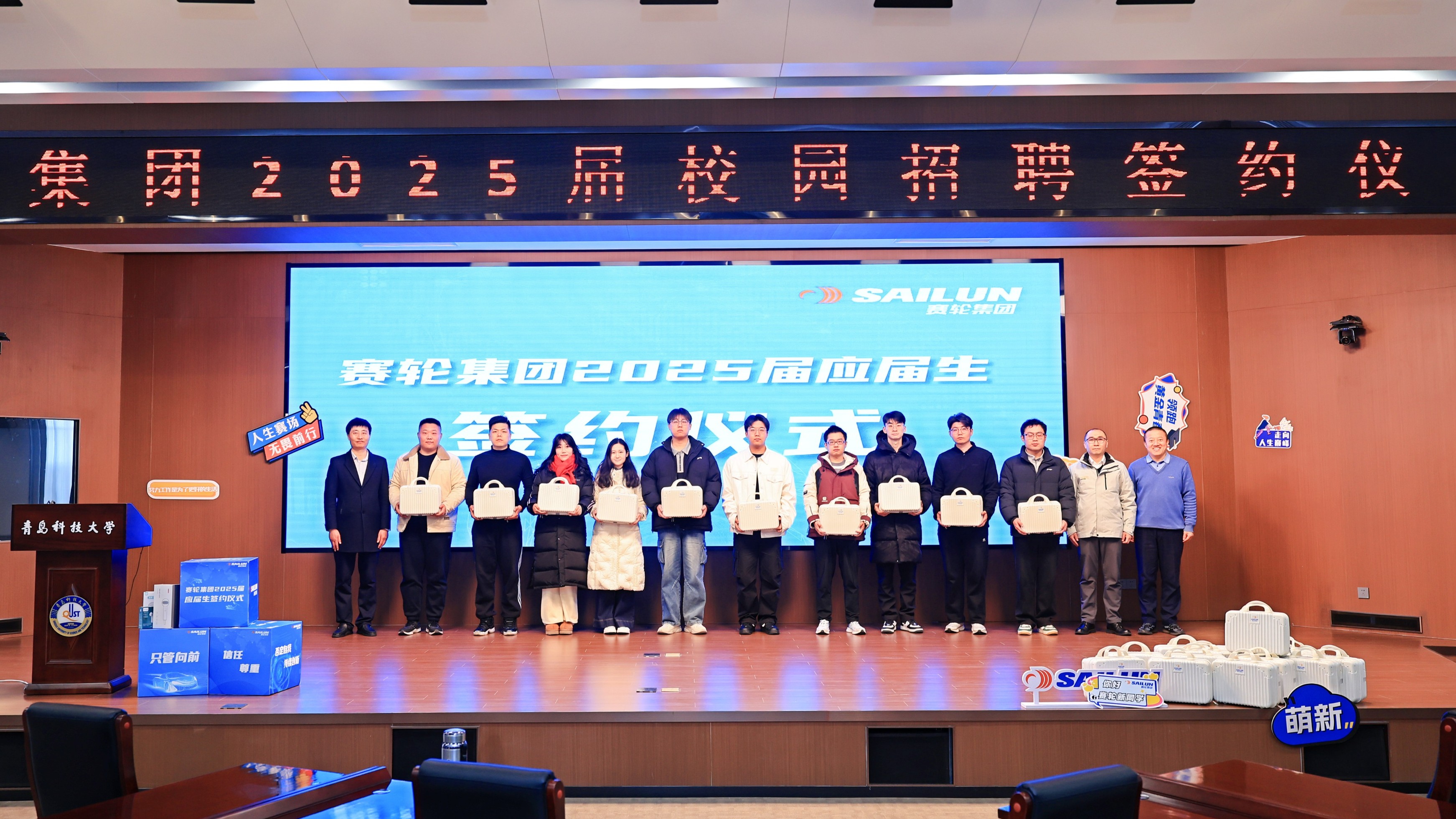 仪式上,杨凯介绍了赛轮集团的发展历程、企业文化和未来战略。他表示,目前已有近400名青科大优秀校友在赛轮集团各业务板块担当重任、施展才华。赛轮集团将继续为应届毕业生打造宽广的职业发展舞台和系统的培训体系,助力他们快速成长。徐华介绍了学校与赛轮集团在人才培养、科技创新、成果转化等方面合作开展情况,并勉励即将踏上工作岗位的毕业生牢记橡胶品格,发扬科大精神,在新的岗位上展现出科大学子的风采与实力,为赛轮集团的发展贡献力量。在互动交流环节,毕业生们踊跃提问,涵盖职业发展路径、工作环境、未来前景等多个关注点,赛轮集团的招聘团队一一进行解答。与会嘉宾共同为签约学生发放了赛轮定制大礼包。