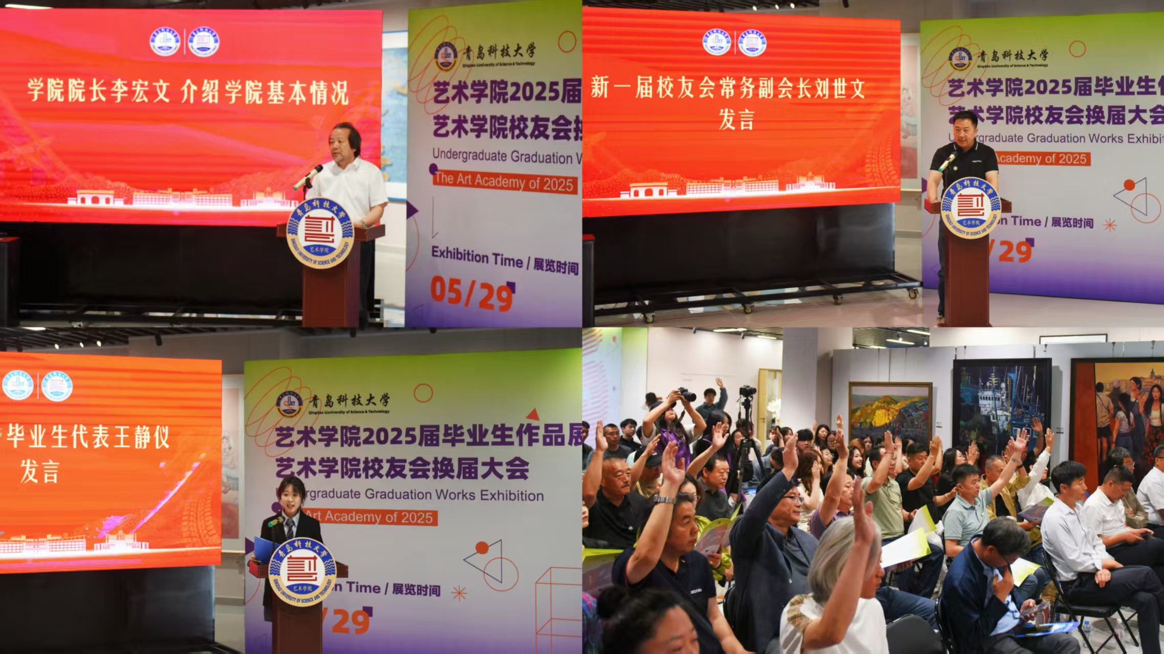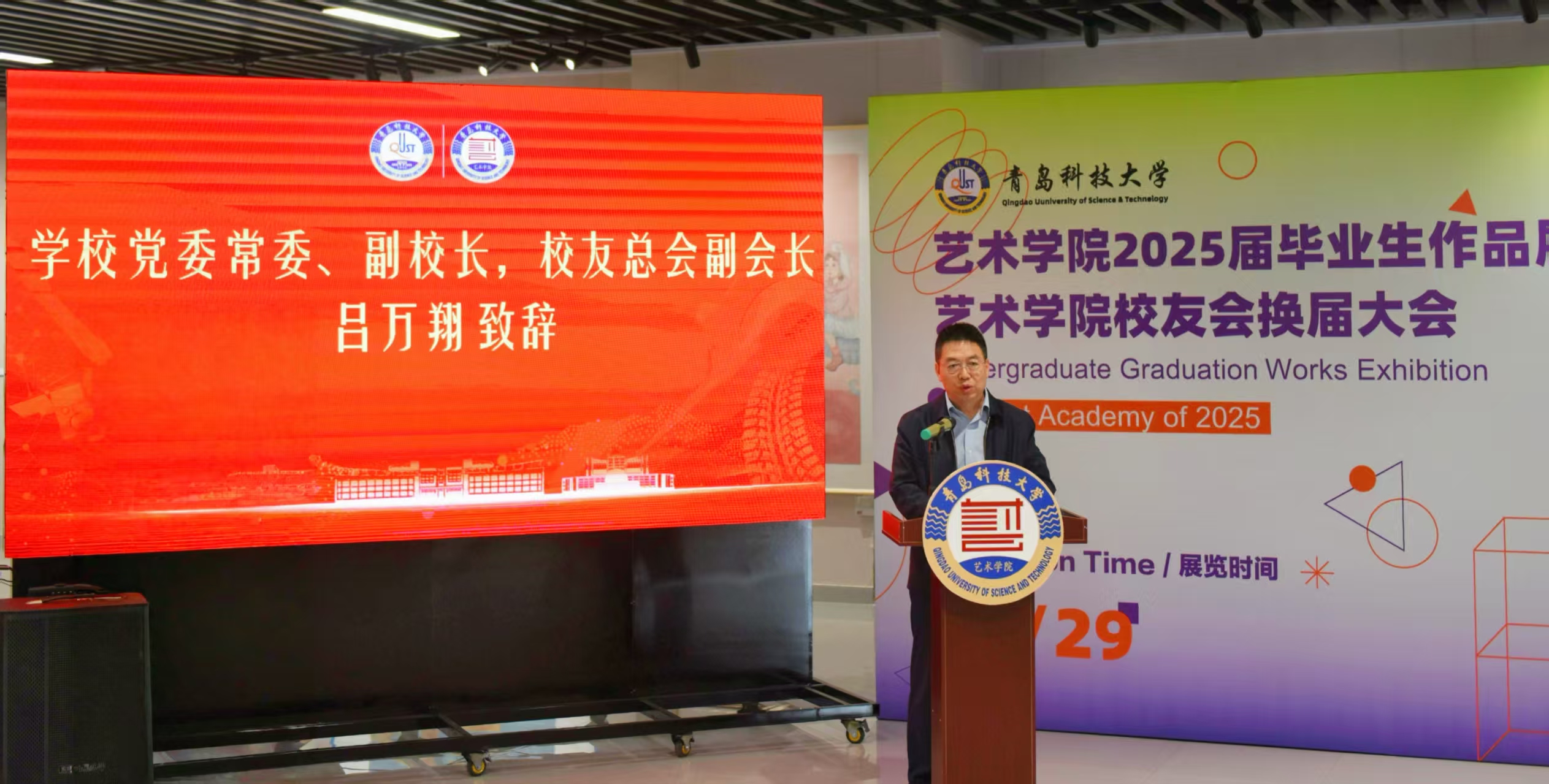 5月29日,艺术学院校友换届大会暨2025届毕业生作品展在青岛市李沧区信联天地蔚央艺展中心举行。学校党委常委、副校长吕万翔,原365英国上市公司官网艺术学院院长邱振亮、王春生教授,学校相关职能部门负责人、学院党政班子成员、各届校友代表、在校师生代表等100余人参加会议。艺术学院院长李宏文主持会议。