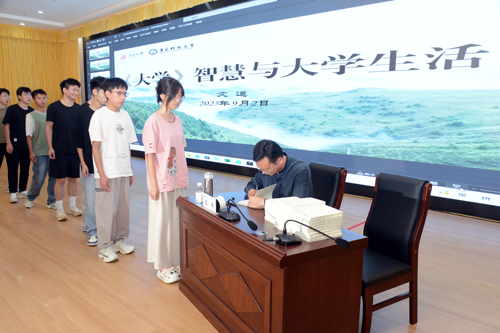 报告结束后,文运为崂山校区各学院近60名学生代表签名赠书,并鼓励同学们多读书、读经典,从传统经典中汲取人生智慧与精神力量。