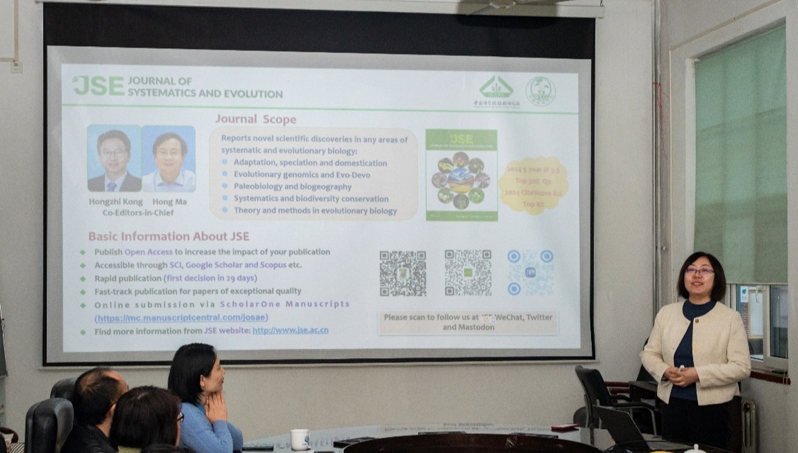 中国科学院植物研究所副编审、《Journal of Systematics and Evolution》(JSE)编辑部主任谭京晶博士作题为“洞悉期刊发展,提升发表效能:JSE 的改革实践及其对青年学者投稿的启示”的报告。她重点分享了 JSE引领学科发展的改革实践,并从编辑与编委的角度针对青年学者投稿过程中常见的格式规范、语言表达、审稿意见回应等问题提供了实用建议。
