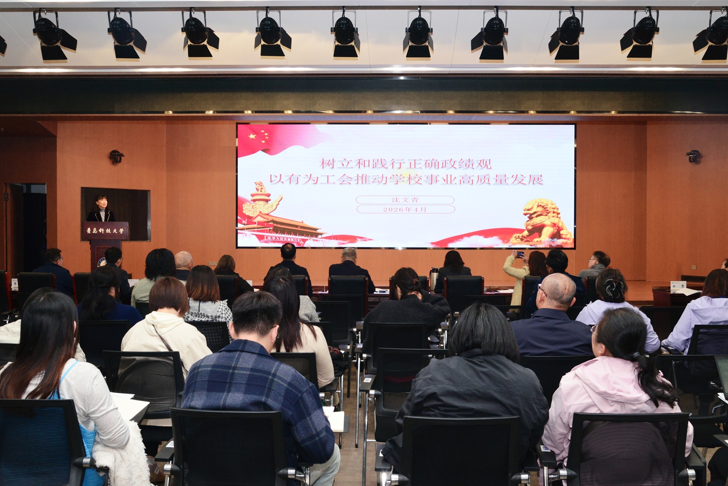 4月21日下午,学校第十二届工会委员会第六次(扩大)会议暨2026年工会(妇委会)工作会议在崂山校区软控学术报告厅召开。党委副书记沈文青出席并做了题为“树立和践行正确政绩观,以有为工会推动学校事业高质量发展”的党课。