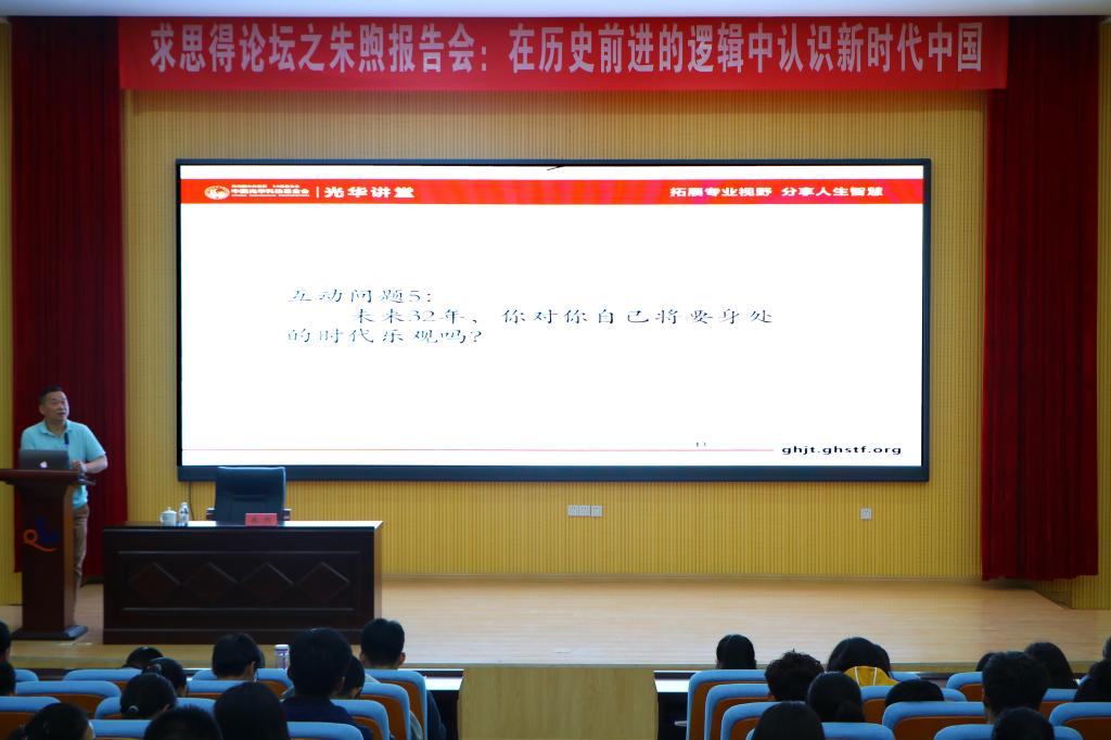 萧少秋以“从历史方位角度理解伟大时代”为主题全面解读了中国共产党领导的革命与改革正推动着经济迅猛发展和产业化能力的迅速提升的现状,阐释了中华民族在不断学习和完善的过程中进步的论断。朱煦以“在历史前进的逻辑中认识新时代中国”为题,围绕历史前进的逻辑、认识新时代的中国、分享学习近平新时代中国特色社会主义思想心得和青年的政治使命四个主题进行讲述。两位导师以渊博的知识、精深的文化造诣、深厚的理论功底、敏锐的观察视角以及亲和的授课方式,赢得了师生的阵阵掌声,现场互动环节气氛热烈。