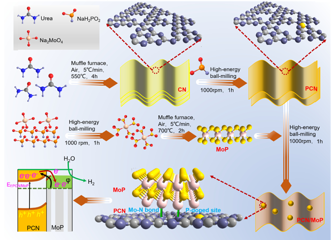图1.P掺杂g-C3N4/MoP异质结光催化剂的合成路线示意图