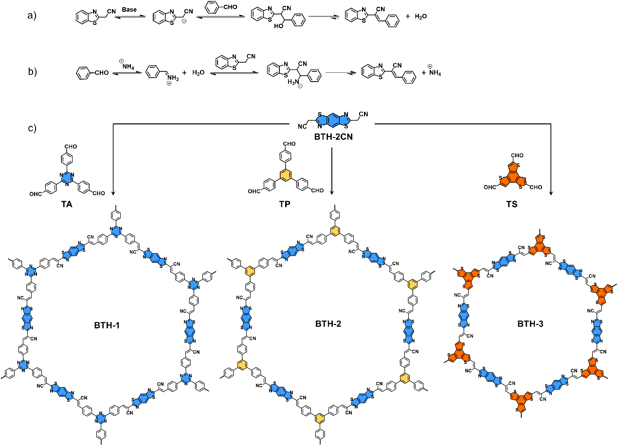 近日,王元成博士基于Knoevenagel反应报道了一种新的制备碳碳双键连接的共轭COFs的策略。在该研究中碳碳双键和缺电子的苯并二噻唑结构被首次整合到了p共轭COFs中,并且通过给体单元的改变实现了p共轭COFs材料中强的D-A作用的有序引入。进一步,他们研究了材料的光催化裂解水制氢性能,发现强D-A作用的引入大大加强了催化性能,产氢速率达到15.1 mmol h−1g−1。
