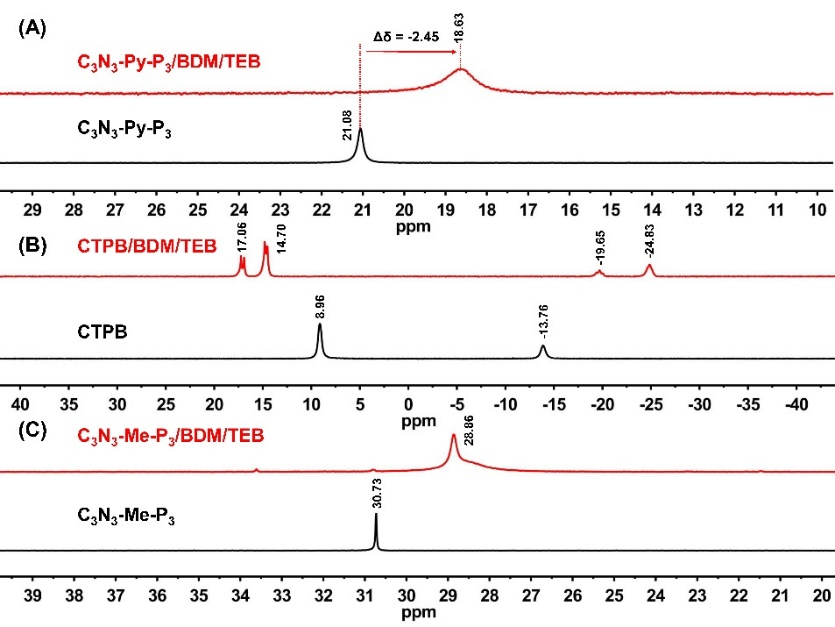 作者比较了三种不同碱性和结构的磷腈(CTPB、C3N3-Py-P3和C3N3-Me-P3)与TEB结合的二元体系。研究发现,碱度相对较低且分子尺寸较大的C3N3-Py-P3表现出最高的催化活性和选择性。原位31P NMR(图2)实验表明,磷腈碱和TEB形成二元协同体系,碱性较低的C3N3-Py-P3与TEB协同效应较强,催化活性更高。在1 MPa CO2和80 °C条件下,CHO/C3N3-Py-P3/BDM/TEB = 24000/1/1/2时,催化活性TON值可达12240,所得聚合物分子量高达275.5 kDa,且具有完美的CO2/CHO交替序列(图3)。