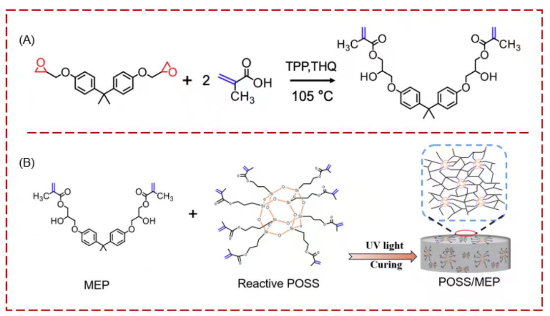 图1.POSS/MEP树脂复合材料制备,(A)端接甲基丙烯酸酯双酚A环氧树脂(MEP)的合成,(B)POSS/MEP复合材料UV固化过程。