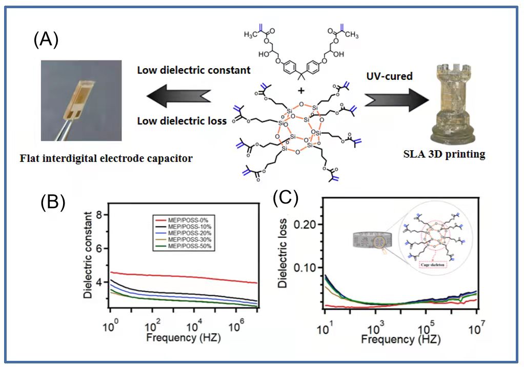 图2.(A)平板叉指电极电容器和3D打印模型,(B、C)POSS/MEP复合材料的介电常数和介电损耗。
