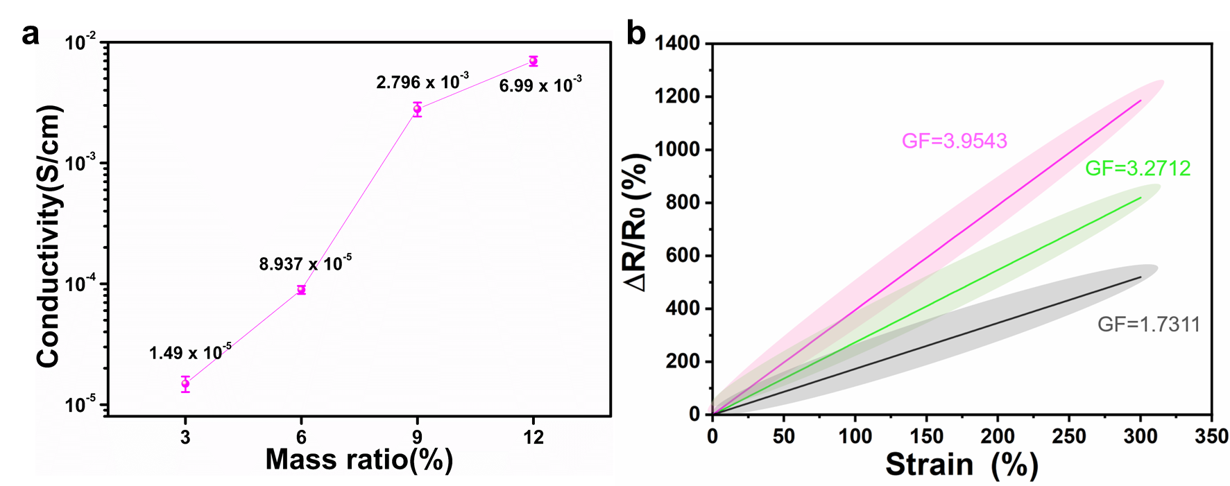 图6(a)不同改性MXene含量的PDMS@MXene的导电性;(b)具有不同改性MXene含量的PDMS@MXene的相对电阻随应变的变化