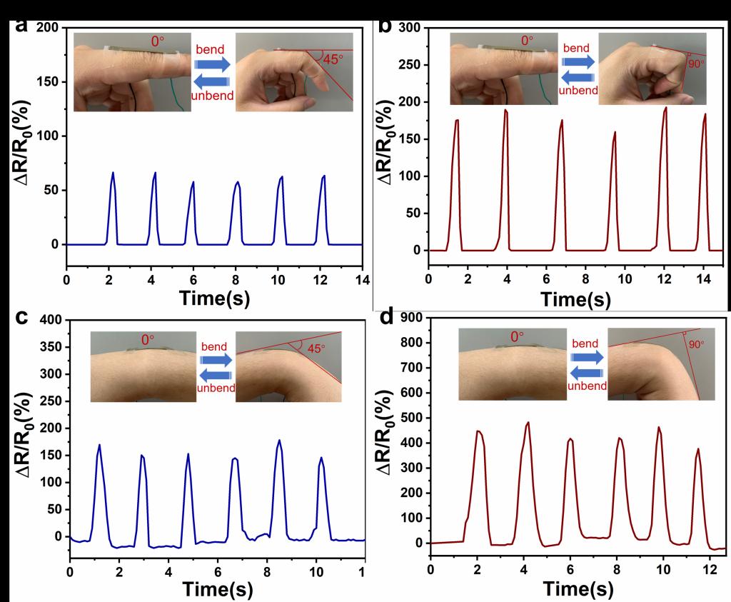 图2 SS0.4-PDMS-DH0.6-Ag10用于监测关节运动:手指弯曲(a)45°,(b)90°;腕关节弯曲(a)45°,(b)90°