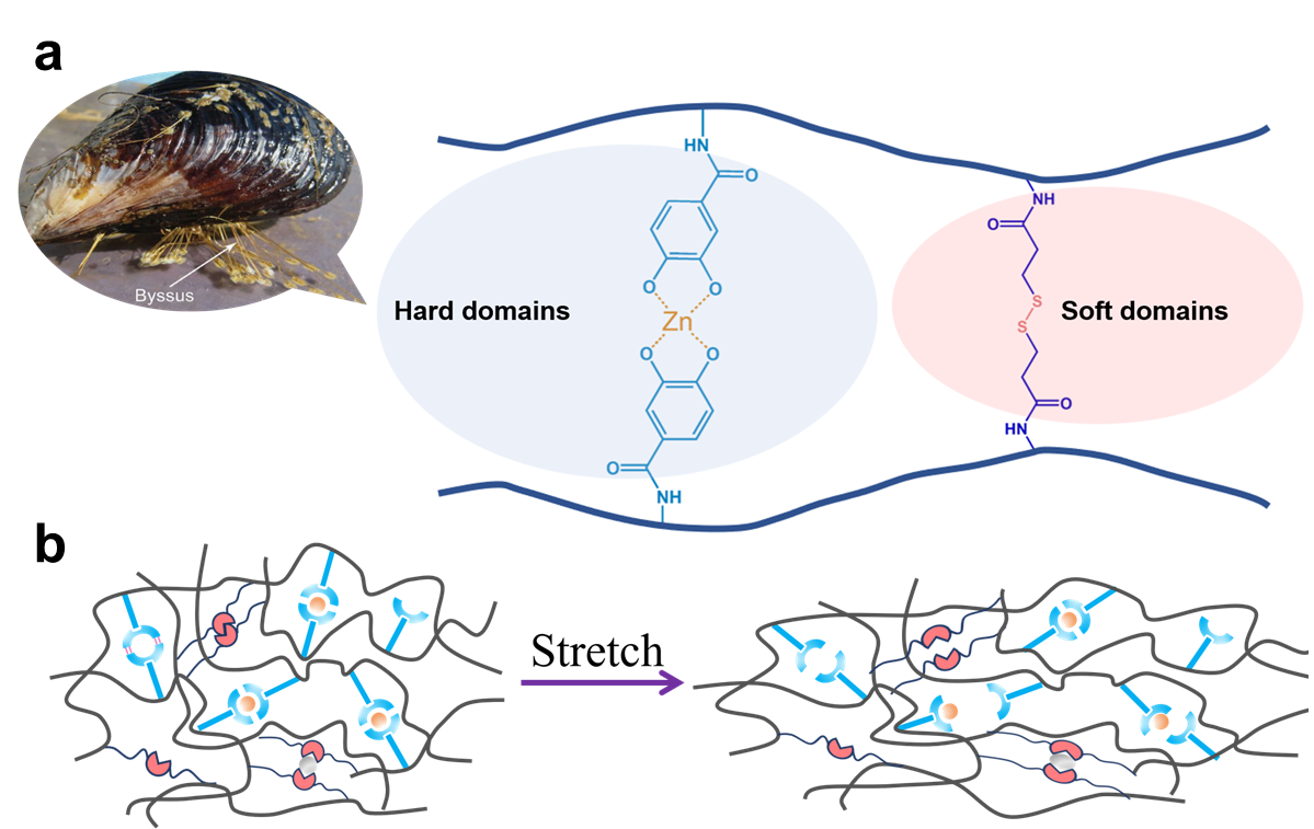 图1(a)以贻贝为灵感设计的聚合物网络结构;(b)拉伸过程示意图