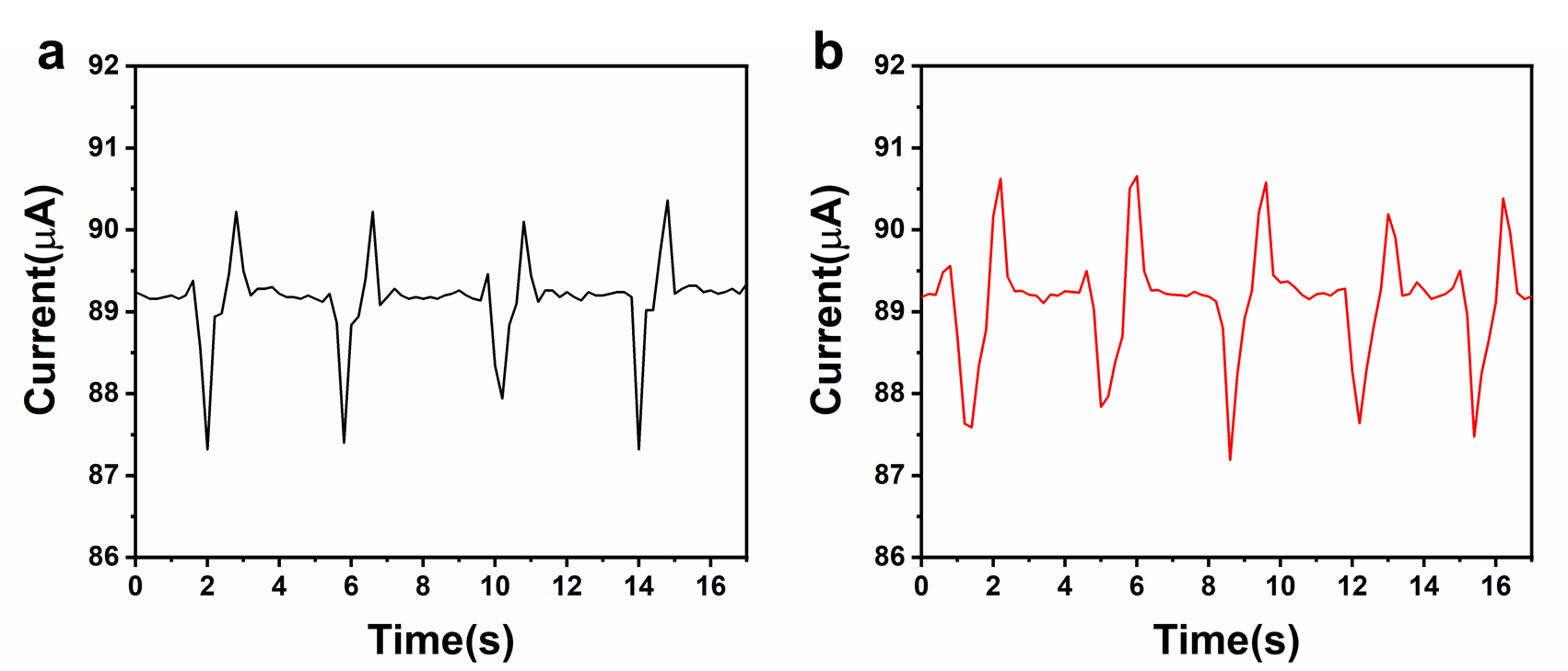 图4自愈前(a)和自愈后(b)10wt%C-MXenes/PDMS-2检测吞咽动作产生的实时电流变化