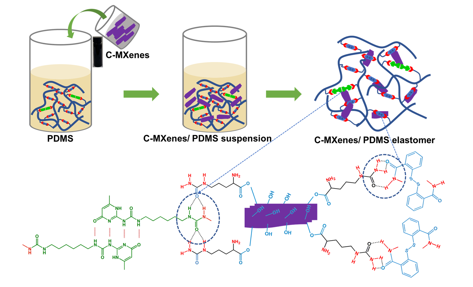 复合导电材料的制备往往需要引入导电纳米颗粒,但其在聚合物基体中分散不均的问题制约材料性能提升及应用拓展。鉴于此,利用富含酰胺键的小分子改性二维导电填料MXene进,并将其引入自修复有机硅双交联网络,制备具有良好导电性能的有机硅弹性体。改性后的MXene与有机硅网络形成氢键从而达到均一分散。弹性体不仅可在室温下通过多重氢键和动态二硫键的相互作用修复损伤,恢复机械性能,而且能准确地监测人体肌肉的运动。该工作以“Tough, stretchable and self-healing C-MXenes/PDMS conductive composites as sensitive strain sensors”为题发表于期刊《Composites Science and Technology》(Composites Science and Technology, 2021, 216:109042. IF=8.528,中科院一区TOP期刊)上。