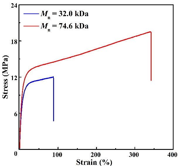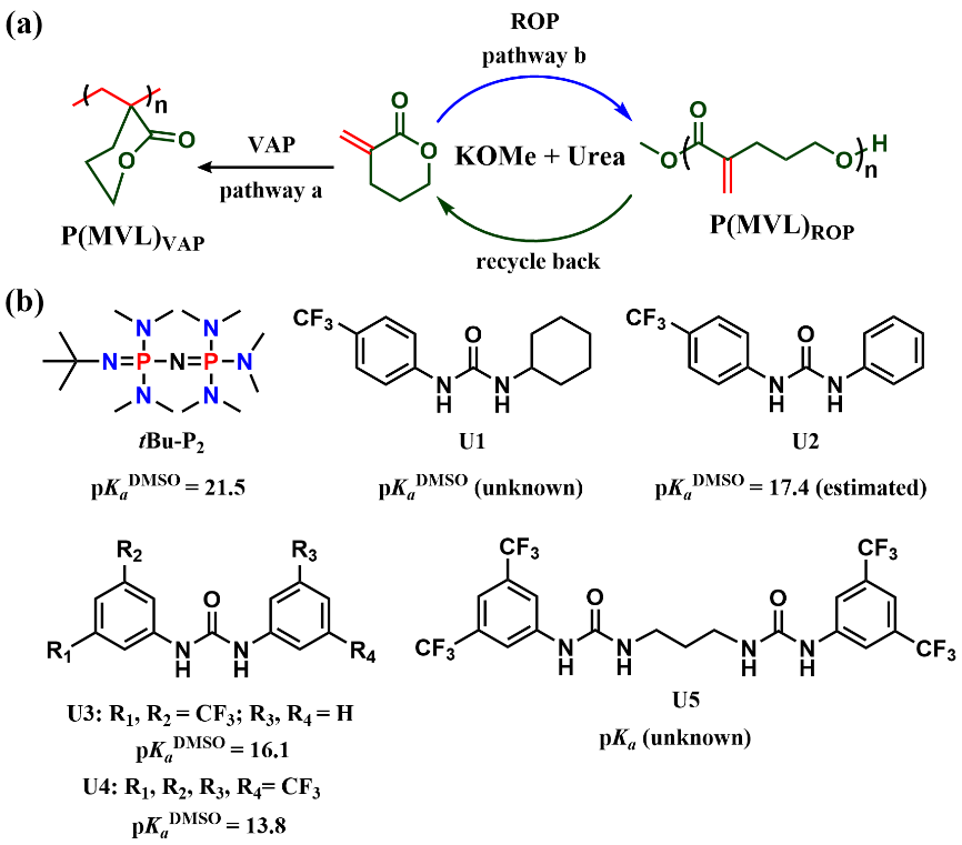 α-亚甲基-δ-戊内酯(MVL)可以由生物质来源的δ-戊内酯(δVL)与甲酸乙酯通过两步反应简单制备。作为一种双官能团环内酯单体,之前的研究集中于MVL的环外双键加成聚合(VAP,pathway a),而通过开环聚合制备可回收聚酯仍然是一个挑战(ROP,pathway b)。在前期工作的基础上,365英国上市公司官网沈勇副教授和李志波教授通过使用强碱与一系列具有不同结构和pKa值的脲构筑二元催化体系,成功实现了MVL的化学选择性开环聚合,聚合呈现“活性”/可控聚合特性,所得聚合物端基、分子量及分子量分布可控。使用有机磷腈碱tBu-P2与二元脲U5为催化剂时,制备得到的聚酯P(MVL)ROP分子量高达74.6 kDa。值得注意的是,高分子量P(MVL)ROP表现为韧性塑料,其力学性能与商品化的等规聚丙烯(PP)和低密度聚乙烯(LDPE)相当。此外,通过硫醇-烯“点击化学”反应可以对P(MVL)ROP侧基的双键进行后修饰,进一步调控聚酯的性质。