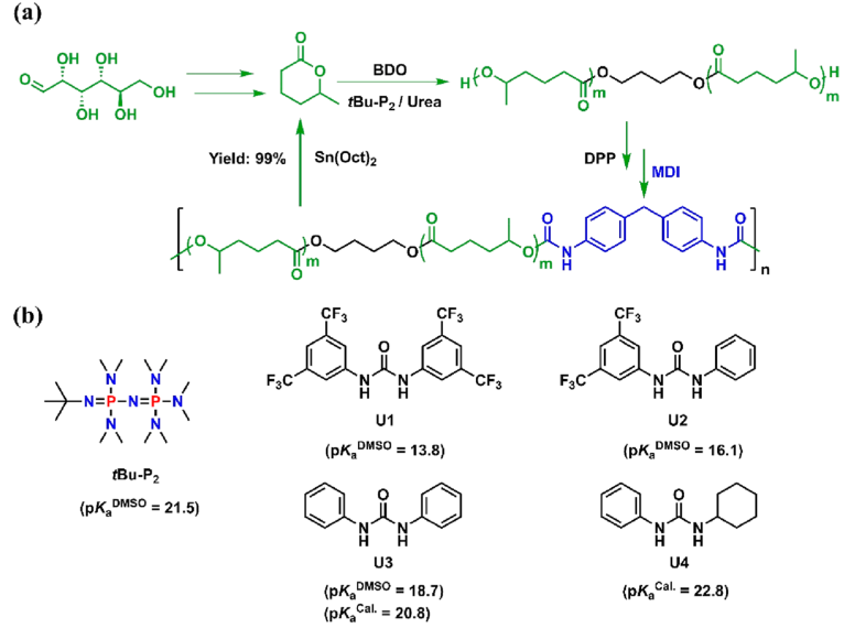图1.(a)利用生物基δCL制备化学可循环聚氨酯;(b)有机碱和脲的化学结构
