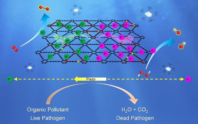 压电场增强石墨炔纳米酶性能。团队通过硫原子掺杂合成了含有丰富缺陷和空位的硫掺杂石墨炔纳米片,硫原子的引入使石墨炔在超声作用下能够显著提高其纳米酶性能。将此纳米酶应用于污水处理中,有较高的TOC去除效率,同时还具有良好的抗菌性能。该工作发表在Nano Today(2022, 43, 101429,影响因子: 20.722)上,我校博士生白强为该论文的共同一作,隋凝副教授、朱之灵副教授和王兆波教授为共同通讯作者,我校为唯一通讯单位。